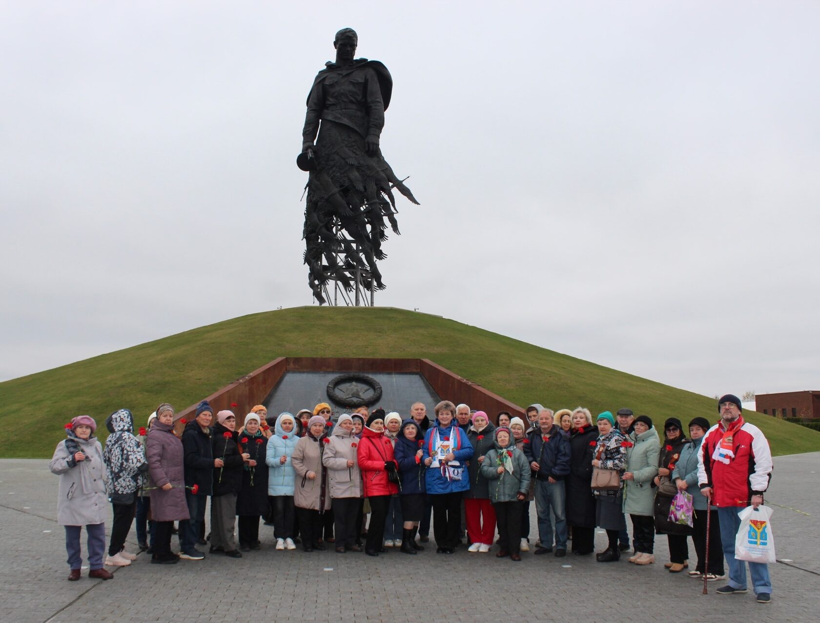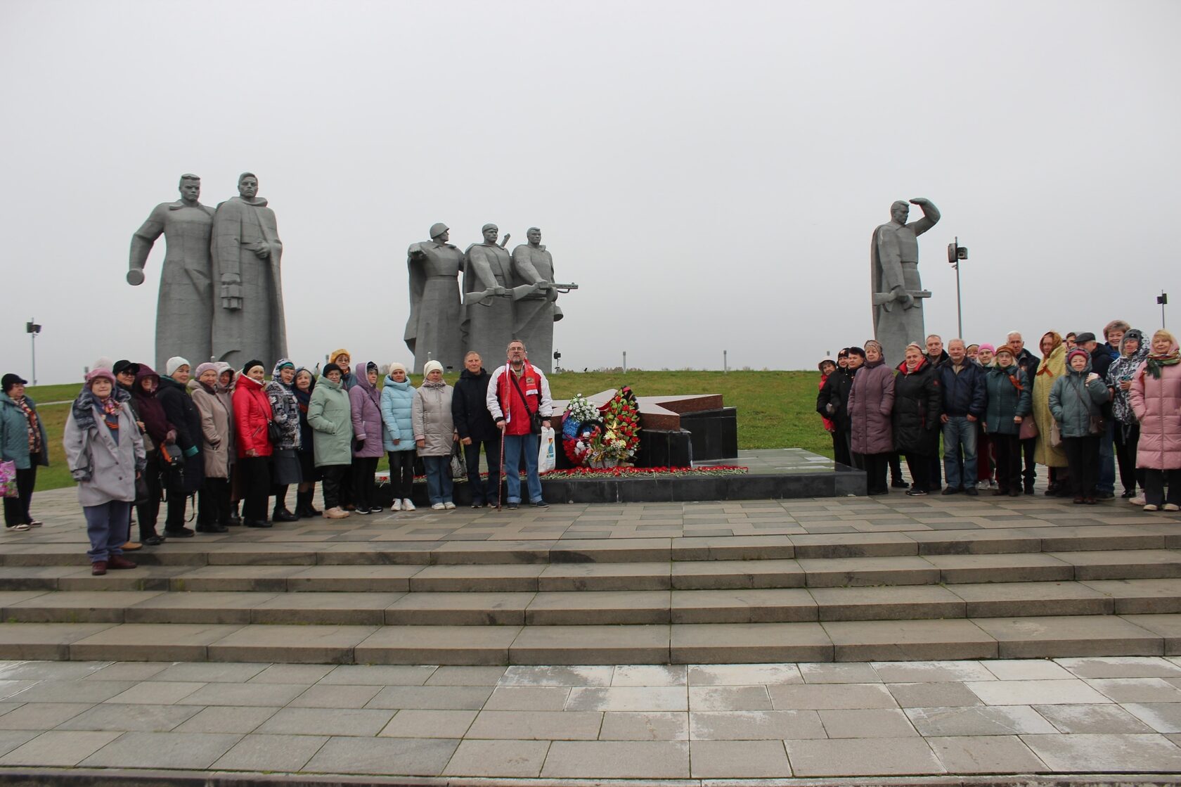 Ветераны побывали у Мемориала Советского Солдата. На вершине восьмигранного 10-метрового искусственного холма возвышается колоссальная фигура солдата высотой 25 метров. Молодой воин стоит в гимнастёрке и развевающейся плащ-палатке, которая внизу переходит в стаю 35 журавлей… они взмывают в Небеса.