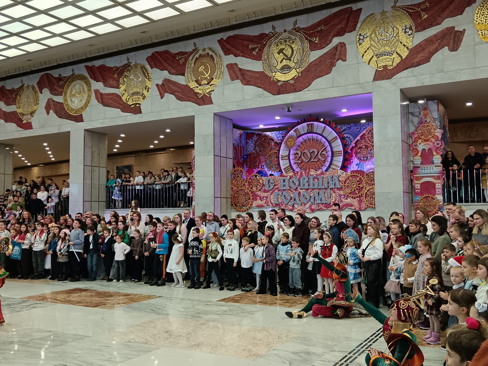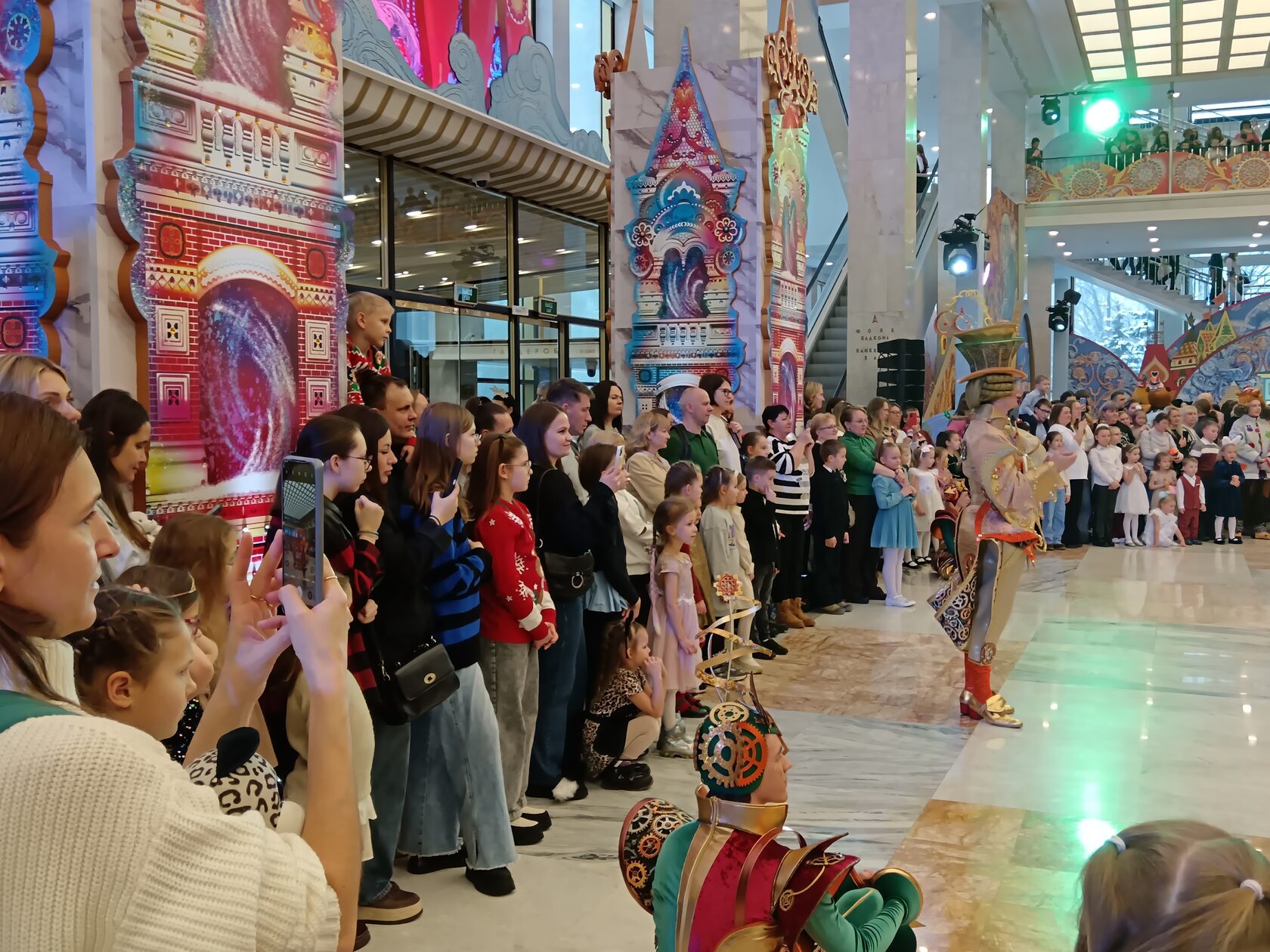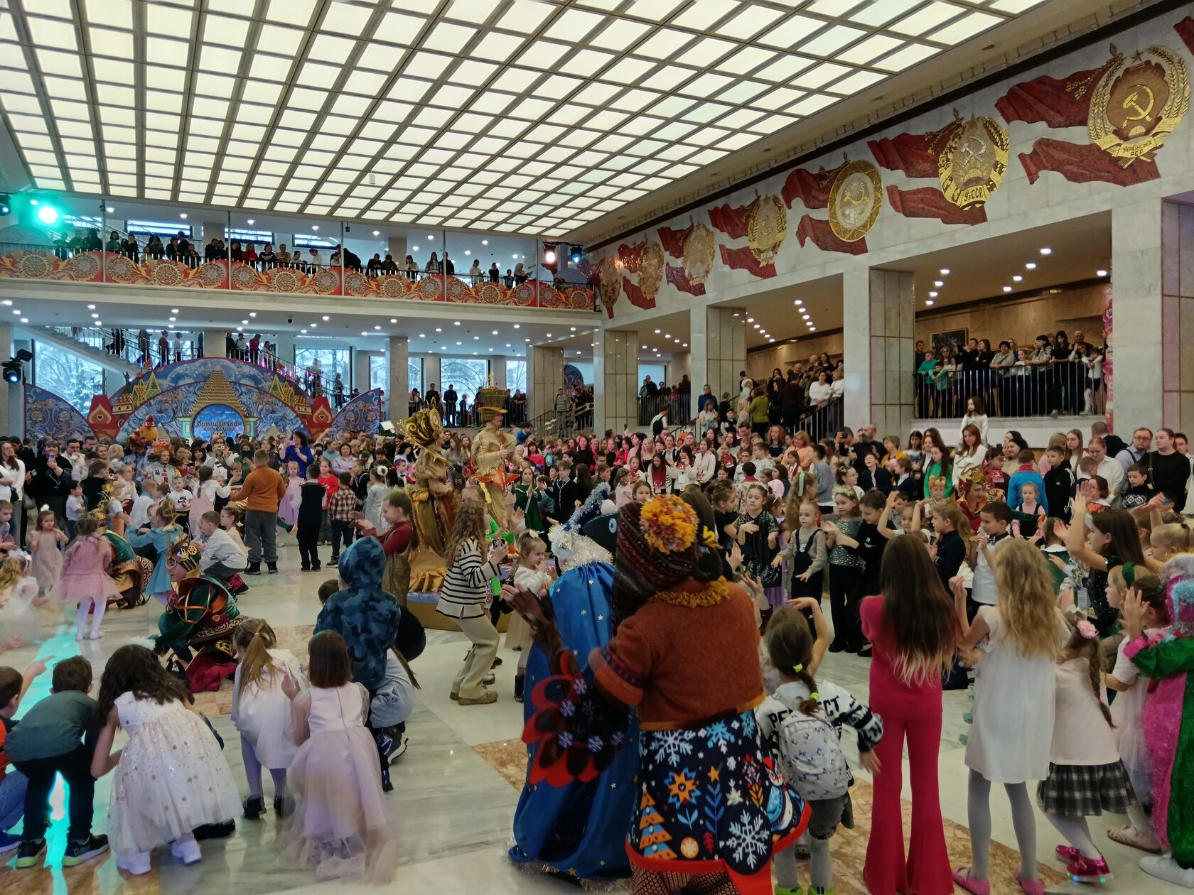 В Гербовом фойе участники закружили «Минут веселых хоровод». Поиграть всех желающих пригласил знаменитый Кот Ученый, а с ним и другие обитатели непушкинского Лукоморья: тетушка Метелица, братья Снежковы, Русалка, Зайка Знайка и ежик-непоседа. Были песни, танцы и конкурсы. В финале появились Дед Мороз и Снегурочка, чтобы поздравить гостей и зажечь огни на главной елке.